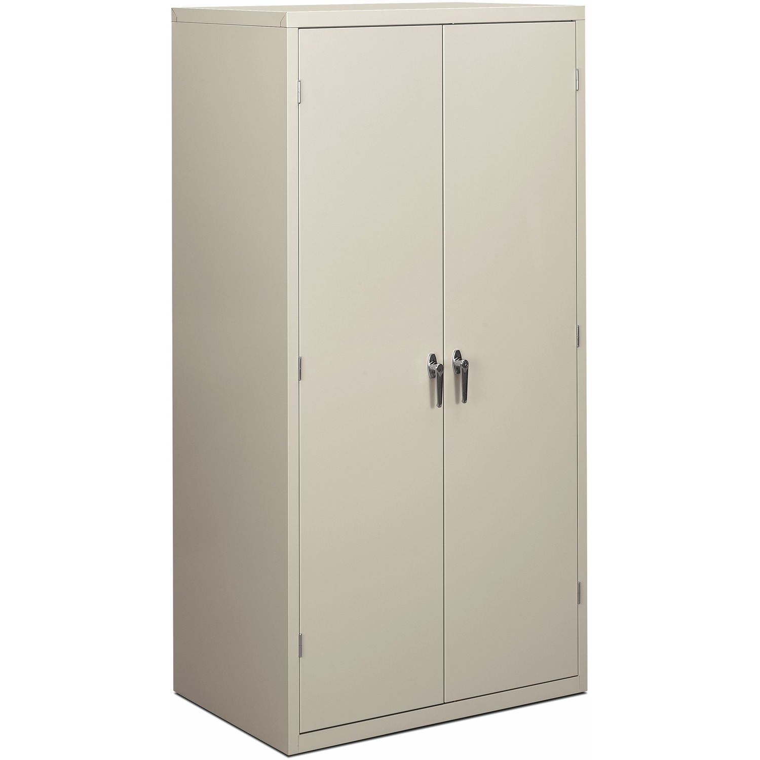 Steel storage cabinet has shelves that adjust in 2" increments and each hold up to 156 lb. Heavy-gauge construction features a steel reinforced base with leveling glides. Lockable door has one locking handle and one fixed handle. Storage cabinet is equipped with One Key interchangeable, core-removable lock. Cabinet is certified by SCS to be in compliance with specific, indoor, air-quality emission requirements and meets or exceeds ANSI/BIFMA standards.